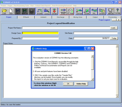 Please load a sample file first and then vary the inputs according to your study requirements, to determine if CORMIX is applicable to your problem. - Access to the PDF CORMIX User Manual only.